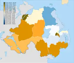The distribution of Remain and Leave votes varied dramatically across the country.[1] Remain won every Scottish district, most London boroughs, Gibraltar and the predominantly Catholic parts of Northern Ireland, as well as many English and Welsh cities. Leave by contrast won almost all other English and Welsh districts and most of the predominantly Ulster Protestant districts, and won a majority in Wales as a whole as well as in every English region outside London. These results were interpreted by many commentators as revealing a "split" or "divided" country, and exacerbated regional tensions.[1][143]