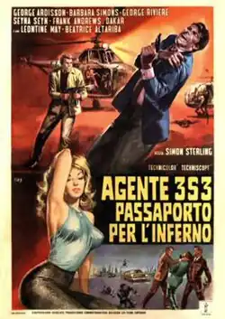 Agente 3S3: Passaporto per l'inferno or Agent 3S3:Passport to Hell is a 1965 Italian adventure-eurospy film directed by Sergio Sollima, here credited as Simon Sterling. This is the first chapter in the Sollima's spy film trilogy, and inaugurated the film series of the Agent 3S3 played by George Ardisson.[2][3] It is also the first Sollima's full-length film, after the segment he shot for the anthology film Of Wayward Love three years before.