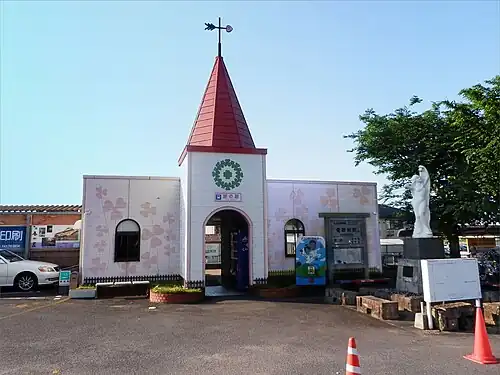 The station is on the ground level with two opposing side platforms. The station building faces the south platform and has a church-like exterior with a cross on top. The building is equipped with a station office, waiting room, flush toilets, and vending machines. A covered waiting room is installed on the north platform.[1][2]