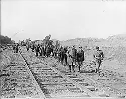 The CF du ARB remained behind Allied lines during World War I.[14] It fell within a security zone known as the Reserved Zone. Civilians living within this zone had free travel within the Canton in which they lived. To travel beyond their own Canton, or in and out of the Reserved Zone, a sauf-conduit (identity card) was required. Civilian passengers had to leave their train and go into the station building to have their papers checked when crossing Cantons. A procedure which led to complaints as some passengers missed their train when it departed whilst their papers were being checked. Military personnel had their papers checked on board the train. Services were reduced in frequency, with military and freight traffic taking priority.[15] Civilian services were reduced during the war, with further reductions inn 1917 and 1918.[16] In March and April 1918, Aire-sur-la-Lys came within shelling range of German artillery following gains made by the Germans during the Spring Offensive.[17] In late April, 296 Railway Company, Royal Engineers established a major depot at Rang-du-Fliers.[18] This included a repair facility for both standard- and metre-gauge locomotives. Aire-sur-la-Lys was bombed on 16 May, but damage to tracks was repaired within 24 hours.[19] In August, a chord was laid at Gourgesson Junction enabling trains to run directly between Aire-sur-la-Lys and Anvin without reversing.[18]