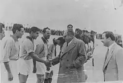 ![]() The GCPI director shakes hands with Al-Quwa Al-Jawiya and Al-Minaa players before the start of the match at Basra in 1954. The match ended in a 1–1 draw. | |