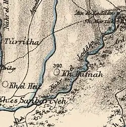 In 1881 the Survey of Western Palestine identified Khirbet Dufnah, meaning "the ruin of Daphne (oleander).[3]