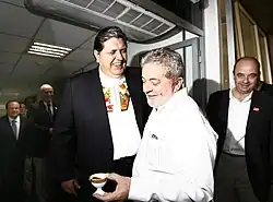 On 9 November 2006, three months after being inaugurated, García signed 12 commercial agreements with President Luiz Inácio Lula da Silva of Brazil,[74][75] strengthening the relationship between the two countries. As part of the IIRSA programme and continuing integration efforts – including the August 2006 negotiations between Petrobras and Petroperú[76] – these new agreements sought to further bilateral cooperation.[77] García offered Peruvian hydropower to meet Brazil's growing energy needs, although further details were not disclosed.[78]