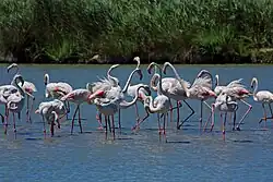 Stretching in the southeastern Adriatic Sea, the coast with a wealth of important habitats makes for a fascinating birdwatching location during peak migration with several wetlands, estuaries and hills provides diversity for both resident and migrant birds.[11] Maybe the most iconic bird of the coast is the vulnerable and extremely rare dalmatian pelican.[12] It breeds on inland lakes and coastal lagoons of Albania such as in Karavasta and Patoku Lagoon.[13][11] The greater flamingo is another prominent and important species that live in the region. It is the largest species of flamingos and widespread in Karavasta and Narta Lagoon.[14]