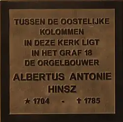 Albertus Antonius Hinsz probably learned his trade with either or both of Joachim Richborn and Franz Caspar Schnitger. In 1728 he settled in Groningen where, on 28 December 1732, he married the widow of Franz Caspar Schnitger, taking over Schnitger's workshop. Hinsz built numerous organs in the North German tradition, across the provinces of Groningen and Friesland. Many of his organs survive to the current day. Tonally, Hinsz organs are noted for their "golden" tone, a result of his tierce-containing mixtures. Architecturally, the casework of his organs follows the pattern of Arp Schnitger. He was a life-long friend of Jacob Wilhelm Lustig, organist at the Martinikerk in Groningen, who also came from Hamburg. Hinsz died during the construction of the organ at Uithuizermeeden. He is buried in the Lutherse Kerk in Groningen, where he is commemorated with a memorial stone.