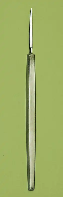 He introduced iridectomy for glaucoma,[6] identified retardation of the eyelid in Basedow's disease,[5] and described the combination of retinitis pigmentosa and perceptive deafness in Usher's syndrome.[7] Also, he provided early descriptions of optic neuritis (1860),[8] chronic progressive external ophthalmoplegia (1868).[9] and papilledema (involving four patients with brain tumor and a swelling of the optic disc).[5][10] In addition, he is credited with design of a specialized knife, the "Von Graefe knife", for cataract surgery.[11] This knife was used till the 1960s. The eponymous "Gräfe's sign" is associated with Graves-Basedow disease.[12]