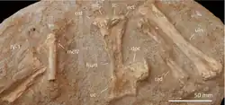 | A, humerus of holotype; B, radius and ulna of holotype; C, sternum of holotype; D, referred metacarpal IV; E, metacarpal IV and scapulocoracoid of holotype; F, femur of holotype. | |