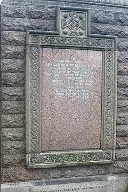 He is buried near his home, in the north section of Dean Cemetery in Edinburgh towards the south-west corner of the north section. He is buried with his wife Ellinor (1885–1918), some 26 years his junior.