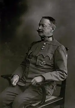 A close associate of the army chief of staff Conrad von Hötzendorf, Krobatin was appointed Imperial and Royal Minister for War on 12 December 1912 and as an integral member of the "war party" gave his full backing to the hawkish element in the military in their calls for an immediate attack on Serbia following the Assassination of Archduke Franz Ferdinand on 28 June 1914 and the July Ultimatum.[3] With the outbreak of the First World War, Krobatin was responsible for the task of harnessing the economies of industrial Austria and agrarian Hungary to ensure the now mobilised military was supplied with vital arms and munitions as well as increasing industrial efficiency to meet the needs of a state with a large cohort of its industrial population no longer available for industrial and food production given their enlistment for war.[4] According to a number of sources, Krobatin struggled in his task for the first two years of the war, and although he never really harnessed the economy efficiently, he succeeded in tripling the level of artillery available at divisional level.[3]