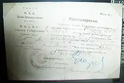 Already in 1918, the All-Union Central Council of Trade Unions was effectively subordinate to the Soviet authorities. Trade union structures became assistants to the Soviet authorities in the confiscation of food. The Military Food Bureau of the All-Union Central Council of Trade Unions operated under the People's Commissariat of Food (Narkomprod) of the RSFSR, which, together with it, supervised the workers' food detachments.[2] At the local level, there were provincial and district workers' bureaus of the All-Union Central Council of Trade Unions at the food committees, which were supposed to unite local trade union organizations, form workers' food detachments and manage their activities.[2] A member of a food detachment often received a certificate on behalf of two bodies at the same time - the People's Commissariat of Food and the All-Union Central Council of Trade Unions bureau.
