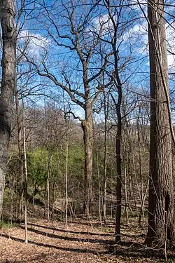 The Queens Giant (also known as the Alley Pond Giant or Alley Pond Park Giant), at 40°45′12″N 73°44′49″W / 40.75320°N 73.74708°W / 40.75320; -73.74708, is an old tulip poplar (Liriodendron tulipifera) that is located in Alley Pond Park.[56] It is the tallest carefully measured tree in New York City, measuring 133.8 feet (40.8 m) tall with a 19-foot (5.8 m) circumference as of 2004, and it might also be the oldest living thing in the New York metropolitan area, being between 350 and 450 years old in 2004.[57] A tree in Staten Island, known as the Clove Lake Colossus, has a more massive trunk, but it is only 119 feet (36 m) tall.[56] However, NYC Parks is unsure of the margin of error regarding the Queens Giant's age, and its true age may have a margin of error of several decades or centuries. Some arborists estimate the tree's age at 250 years, making it younger than other trees in the city.[58] The nearby Great White Oak in Douglaston, though smaller, may have been about 600 years old when it was cut down in 2009, though that tree's age is also disputed.[59]