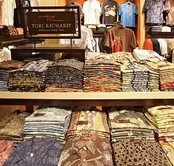 After World War II, many servicemen and servicewomen returned to the United States from Asia and the Pacific islands with aloha shirts made in Hawaii since the 1930s.[25] One significant manufacturer was Shaheen, which began business in 1948.[6] Following Hawaii's statehood in 1959, when extant tropical prints came to be regarded as rather tacky, designer Alfred Shaheen became noted for producing aloha shirts of higher chic and quality, and Elvis Presley wore a Shaheen-designed red aloha on the album cover for Blue Hawaii (1961).[25][26] In 1956, Tori Richard, a well-known brand of alohas was established.[27][28] Spooner's of Waikiki, precursor of Reyn Spooner, also established business in 1956.[29]