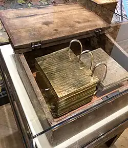 On November 19, 1823, at age 25, Smith died of mercury poisoning from calomel, which had been administered to cure a case of "bilious colic". His death occurred two months after Joseph's first visit to the hill from which he was eventually said to have recovered the golden plates that would later be the source for the Book of Mormon. According to a history written by his mother, Lucy Mack Smith, as Smith lay dying he called each member of his family to his bedside to give them counsel. To his brother Hyrum, Smith said, "I have done all I could to make our dear parents comfortable. I want you to go on and finish the house."[7] He urged his brother Joseph to fulfill all of the requirements to obtain the record.[8] Smith's death had a significant effect on the family, resulting in Joseph taking more of a leadership role.