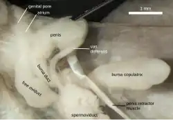 The penis is distinctive by its small size (roughly half the length of the bursa copulatrix and duct) and lack of a penial appendage (although vestigial knobs are occasionally present). However, the penial appendage of A. valentianus may sometimes be inverted inside the penis, so slitting open the penis is necessary to confirm its absence.[1][4]