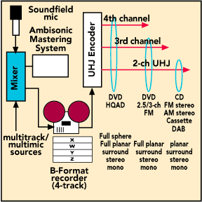A UHJ decoder, primarily for the 2-channel format, was the original component required for consumer experience of Ambisonics. When the system was first being promoted the push was two-pronged: on the one hand encouraging record companies to endorse the system and release discs (this was, in retrospect, ill-advised: record companies had been burned by quad systems and were not in a mood to endorse anything; and in any case, the people to persuade were engineers, producers and high-profile artists, who could use Ambisonic mixing equipment on sessions at will, just as they had a free rein in using other outboard studio equipment), while on the other hand encouraging hardware manufacturers to sign up as Ambisonic licensees and include decoders in their equipment.
