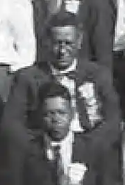 ![]() Ambrose K. Hutchison (top) at a meeting of The Holy Name Society at Kalaupapa, 1920s. His identification in the image is based on the opinions of Hutchison family relatives.[1] | |