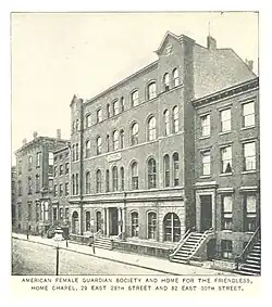 The American Female Guardian Society (full name, American Female Guardian Society and Home for the Friendless) was an American prototype civic improvement association and a pioneer child-saving institution.[1] Incorporated in 1849, and based in New York City, it was an outgrowth of the New York Female Moral Reform Society.[2][3] The Society existed until at least 1941 when its official organ, Advocate and Family Guardian ceased operation.[4]