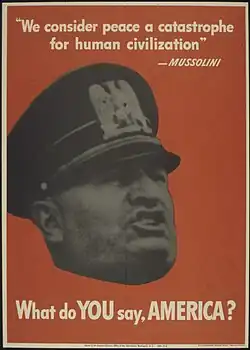 As in Britain, American propaganda depicted the war as an issue of good versus evil, which allowed the government to encourage its population to fight a "just war," and used themes of resistance in and liberation to the occupied countries.[101] In 1940, even prior to being drawn into World War II, President Roosevelt urged every American to consider the effect if the dictatorships won in Europe and Asia.[102] Precision bombing was praised, exaggerating its accuracy, to convince people of the difference between good and bad bombing.[103] Hitler, Tojo, Mussolini and their followers were the villains in American film, even in cartoons where characters, such as Bugs Bunny, would defeat them[73]—a practice that began before Pearl Harbor.[104] Cartoons depicted Axis leaders as not being human.[105]