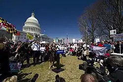 AFP supported the Tea Party movement by obtaining permits and supplying speakers for rallies.[95] AFP helped organize and publicize a "Porkulus"-themed protest on the state capitol steps in Denver, Colorado on February 17, 2009, in conjunction with Obama signing the American Recovery and Reinvestment Act of 2009.[96]: 31 [97] Within hours of CNBC on-air editor Rick Santelli's remarks on February 19, 2009, that criticized the Act and called for a "Chicago tea party," AFP registered and launched the website "TaxDayTeaParty.com," calling for protests against Obama.[96]: 32 AFP had a lead role in organizing Taxpayer Tea Party rallies in Sacramento, Austin, and Madison in April 2009.[15][98] AFP was one of the leading organizers of the September 2009 Taxpayer March on Washington, also known as the "9/12 Tea Party," according to The Guardian.[7] On April 16, 2011, former Republican vice presidential candidate Sarah Palin was the keynote speaker at an AFP annual tax day tea party rally at the state capitol in Madison, Wisconsin.[76][99]
