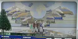 The station hall has been decorated with several murals (1939) created by Dutch artist Peter Alma (1868-1969). The murals reflect the importance of technological advancement, in particular of the railroads.[2] Images of the murals are also used on the window film decorating the outer windows of the platform roof. The station hall also features a 1958 ceramic tile panel, also designed by Peter Alma and manufactured by H. Rijneveld. Until 2003, it was placed in the former Marnixbad swimming pool. Both outside and inside the building are two sculptures (1939) by Theo van Reijn, which are called 'Terugblik and Toekomst der Spoorwegen' (Translated: 'Retrospect and Future of the Railways") together. In 1977, at the opening of the metro station, an artwork by Rudi van de Wint entitled Ruimtediagonaal ('Space Diagonal') was placed in the station hall. The work featured a tube hanging diagonally from the ceiling. This artwork has since been removed.[3] In 2006, the engineering building at the southern end of track 4 was decorated with a number of panels designed by Serge Verheugen.