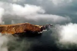 Along with Santa Barbara Island, Anacapa was formed by volcanic eruptions between 19 and 15 million years ago.[8][1] These eruptions are believed to have been caused by thinning of ocean crust as the block containing the northern Channel Islands and Santa Monica Mountains was rotated clockwise by the transverse motion of the Pacific and North American plates.[8] Lava from these eruptions can be found across the region, and in depths of up to 10,000 feet (3,000 m).[8] The rocks that make up Anacapa are composed of lava, breccias, volcanic ash, and cinders.[1]