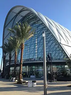 ARTIC opened in 2014 and replaced Anaheim–Stadium station, a nearby depot and train platforms used by Amtrak and Metrolink that first opened in 1984.[6][7][8] Designed by the global architecture firm HOK, the steel-framed ARTIC building's entrance is a 120-foot-tall (37 m) glass wall. The structure has a compound curved shell that is covered with air-filled plastic pillows through which sunlight illuminates the interior. The arched roof is illuminated with multicolored lights visible from the surrounding area.[3]
