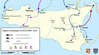 The Angevin invasion of Sicily (1298–1302) was a military campaign launched against the Kingdom of Sicily by an alliance of the Angevin Kingdom of Naples, the Crown of Aragon, and the papacy during the War of the Sicilian Vespers. Fought in the final years of the 20-year long war, the campaign saw the alliance make some territorial gains on the island before ultimately withdrawing in the face of Sicilian resistance.