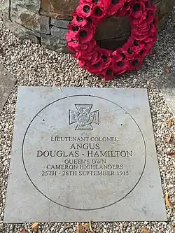 On 25–26 September 1915 during operations on Hill 70 at the Battle of Loos, France, Lieutenant-Colonel Douglas-Hamilton, when the battalions on his right and left had retired, rallied his own battalion again and again and led his men forward four times. The last time he led all that remained, about 50 men, in a most gallant manner, and was killed at their head. It was due to his bravery, and splendid leadership that the line at this point was able to check the enemy's advance.[2][3]