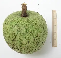 The tree is similar to Annona muricata, but has a more spreading crown and glossy leaves. It is slightly hardier and bears fruit throughout the year.[9] It tolerates brief temperature drops down to 24 °F (−4 °C) when full grown.[10] Its pollen is shed as permanent tetrads.[11] The fruits are nearly round, with dark green skin covered with many short fleshy spines, and are about 15 centimetres (5.9 in) long. Yellow, fibrous pulp – which is aromatic – is sour and bitter, containing many light-brown, plump seeds.[9] There is history of its use as a traditional medicine.[9]