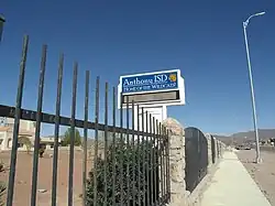 The Anthony Independent School District (AISD) serves the entire municipal limit of Anthony, Texas and extends into portions of Vinton, Texas west of Texas Highway 20 and south to La Union Road.[6] The approximate area covered by the district is 7.78 square miles (20.2 km2).[7]
