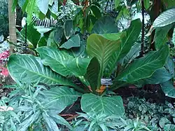 Anthurium hookeri, commonly called a bird's nest anthurium, is a species of flowering plant in the genus Anthurium.[1] Anthurium hookeri possesses some unique features which include, short internodes, dense roots, and lanceolate cataphylls. The leaves have triangular to D-shaped petioles 2–9 cm long, are rosulate, 10–26 cm wide, 35–89 cm long. The leaves exhibit a scalariforme venation and supervolute vernation. Covering the leaves are tiny black glandular punctuates. The berries produced by the plant are white.