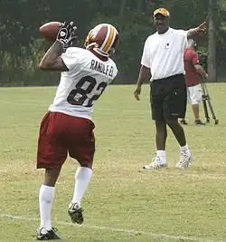 In the 2008 season, Randle El recorded 53 receptions for 593 receiving yards and four receiving touchdowns.[45] In the 2009 season, Randle El recorded 50 receptions for 530 receiving yards in 16 games.[46] In January 2010, Randle El was named in the Bleacher Report's Pittsburgh Steelers All-Decade team for defense and special teams, as a punt returner.[47] He was also named fifth in USA Today's All-Decade kick returners.[48] Randle El was among ten players released by the Redskins on March 4, 2010.[49] The move came as a result of a number of personnel changes in Washington, with new head coach and executive vice president Mike Shanahan – signed alongside new offensive coordinator Kyle Shanahan[50] – opting to make room in the Redskins' depth chart and salary outgoings in preparation of the 2010 free agency period. Randle El stated that he was "shocked" at the move, commenting that "with a new GM and a new coach, I thought you'd be given a shot to show them what you can do."[51]