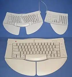 The Apple Adjustable Keyboard is an ergonomic keyboard introduced by Apple Computer, Inc. in 1993 for the Macintosh family of personal computers. The keyboard attaches to the computer via the Apple Desktop Bus port. The last Apple computer released compatible with this keyboard without using a USB to ADB adapter was the Power Macintosh G3 (Blue and White), as it was the last one with the Apple Desktop Bus.