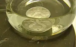 When Germany invaded Denmark in World War II, Hungarian chemist George de Hevesy dissolved the gold Nobel Prizes of German physicists Max von Laue (1914) and James Franck (1925) in aqua regia to prevent the Nazis from confiscating them. The German government had prohibited Germans from accepting or keeping any Nobel Prize after jailed peace activist Carl von Ossietzky had received the Nobel Peace Prize in 1935. De Hevesy placed the resulting solution on a shelf in his laboratory at the Niels Bohr Institute. It was subsequently ignored by the Nazis who thought the jar—one of perhaps hundreds on the shelving—contained common chemicals. After the war, de Hevesy returned to find the solution undisturbed and precipitated the gold out of the acid. The gold was returned to the Royal Swedish Academy of Sciences and the Nobel Foundation. They re-cast the medals and again presented them to Laue and Franck.[12][13]