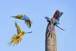 Like all macaws and most parrots, seeds and fruit are the major part of the diet of the genus Ara. The particular species and range of diet varies from species to species. Unlike many birds, macaws are seed predators not seed dispersers, and use their immensely strong beaks to open even the hardest shells. Their diet overlaps with that of some monkey species; in one study of green-winged macaws in Venezuela they shared many of the same trees as bearded sakis, although in some cases they ate the seeds at an earlier stage of ripeness than the sakis, when they contained more poison.[11] Macaws, like other parrots, may consume clay to absorb toxic compounds produced by some poisons.[12] As well, the toxic compounds of some foods may be neutralized by compounds, such as tannins, found in other foods consumed at the same time.