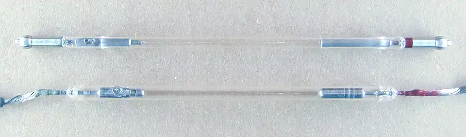 A krypton long arc lamp (top) is shown above a xenon flashtube. The two lamps, used for laser pumping, are very different in the shape of the electrodes, in particular, the cathode (on the left).