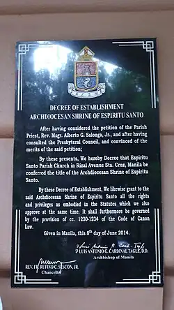 - ^ "Espiritu Santo Parish Declared Archdiocesan Shrine". The Roman Catholic Archdiocese of Manila. Archived from the original on September 24, 2015. Retrieved April 4, 2015.