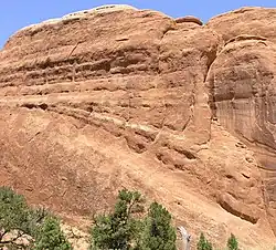 Geological processes that occurred over 300 million years ago caused a salt bed to be deposited, which today lies beneath the landscape of Arches National Park.[13] Over time, the salt bed was covered with sediments that eventually compressed into rock layers that have since been named Entrada Sandstone. Rock layers surrounding the edge of the salt bed continued to erode and shift into vertical sandstone walls called fins. Sand collected between vertical walls of the fins, then slightly acidic rain combined with carbon dioxide in the air allowed for the chemical formation of carbonic acid within the trapped sand. Over time, the carbonic acid dissolved the calcium carbonate that held the sandstone together.[14] Many of the rock formations have weaker layers of rock on bottom that are holding stronger layers on top. The weaker layers would dissolve first, creating openings in the rock. Gravity caused pieces of the stronger rock layer to fall piece by piece into an arch shape. Arches form within rock fins at points of intense fracturing localization, or weak points in the rock's formation, caused by horizontal and vertical discontinuities.[15] Lastly, water, wind, and time continued this erosion process and ultimately created the arches of Arches National Park.[14] All of the arches in the park are made of Entrada Sandstone, however, there are slight differences in how each arch was developed. Entrada Sandstone is categorized into three groups: Slick rock members, Dewey rock members, and Moab members.[16] Vertical arches can be developed from Slick rock members, a combination of Slick rock members and Moab members, or Slick rock members resting above Dewey rock members. Horizontal arches (also called potholes) are formed when a vertical pothole formation meets a horizontal cave, causing a union into a long arch structure. The erosion process within Arches National Park will continue as time continues to pass. Continued erosion combined with vertical and horizontal stress will eventually cause arches to collapse, but still, new arches will continue to form for thousands of years.[17]