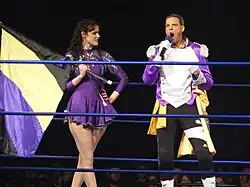 On March 27, 2010, Evans made his debut for Ring of Honor (ROH), working in a dark match, where he, David E. Jones and Ryan Stone were defeated by Johnny Goodtime, Johnny Yuma and Mike Sydal.[12] On January 22, 2011, Evans, under the ring name "Barrister" R.D. Evans, made his television debut at the Ring of Honor Wrestling tapings, where he was unveiled as one of the new members of Prince Nana's The Embassy stable.[13] Though he has not wrestled a single match for ROH since his dark match, Evans has been a part of several storylines involving The Embassy, including filing a lawsuit against Homicide, accusing him of attempted murder, assault and battery, attempted sexual assault and battery, sexual harassment and intentional infliction of emotional distress,[6][14] and making various business deals for the stable, including one that resulted in its name being changed to The Embassy Limited, all with a goal of making Tommaso Ciampa a champion.[6][15] However, after Prince Nana struck a deal with Truth Martini and cost Ciampa his match for the ROH World Television Championship against House of Truth member Roderick Strong, Ciampa turned on Nana at the June 29 tapings of Ring of Honor Wrestling,[16] dissolving The Embassy Limited and making Evans his new primary manager.[17][18] Evans continued managing Ciampa until August, when Ciampa was sidelined with a torn anterior cruciate ligament (ACL).[19][20][21]