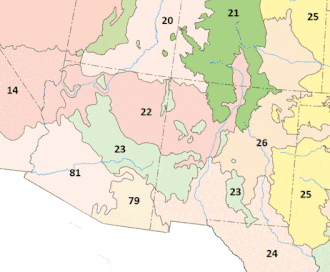 The north is bordered by the east–west Arizona/New Mexico Plateau (22), ecoregion which is part of and is the southern region of the Colorado Plateau. The north region of the Colorado Plateau covers eastern Utah/western Colorado and is the Colorado Plateaus (ecoregion) (20). The extreme southern perimeter of the Colorado Plateaus ecoregion extends east–west along the border regions of Arizona-New Mexico.