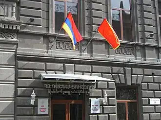 The Armenian Revolutionary Federation (Armenian: Հայ Յեղափոխական Դաշնակցութիւն, romanized: Hay Heghapokhakan Dashnaktsutyun,[a] abbr. ARF (ՀՅԴ) or ARF-D), also known as Dashnaktsutyun[b] (Armenian: Դաշնակցություն, lit. "Federation"[c]), is an Armenian nationalist and socialist political party[37][38][39] founded in 1890 in Tiflis, Russian Empire by Christapor Mikaelian, Stepan Zorian, and Simon Zavarian.[40] As of 2023, the party operates in Armenia, Lebanon, Iran and in countries where the Armenian diaspora is present. The party was also active in Artsakh until the Azerbaijani offensive in September 2023. Although it has long been the most influential political party in the Armenian diaspora, it has a comparatively smaller proportional presence in the Republic of Armenia.[41] As of October 2023, the party was represented in two national parliaments, with ten seats in the National Assembly of Armenia and three seats in the Parliament of Lebanon[42][43] as part of the March 8 Alliance.