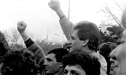 Demonstrations took place in Yerevan in support of the Karabakh Armenians and grew into what became known as the Karabakh movement. By the beginning of 1988, nearly one million Armenians from several regions of the republic engaged in these demonstrations, centered on Yerevan's Theater Square (currently Freedom Square).[65] However, in neighboring Azerbaijan, violence against Armenians erupted in the city of Sumgait.[66] Ethnic rioting broke out between Armenians and Azeris, preventing any peaceful resolution from taking place. Armenians became increasingly disillusioned with the Kremlin's response toward the issue. Gorbachev, who had until then been viewed favorably in Armenia, saw his standing among Armenians deteriorate significantly.[67]