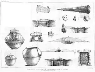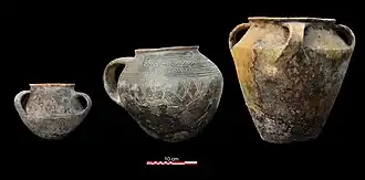 Ceramics are never discovered in these chieftains' tombs. It is generally of biconical shape often associated with handles in variable number (1 to 6). It can be decorated with chevrons, hatched triangles and grooves.