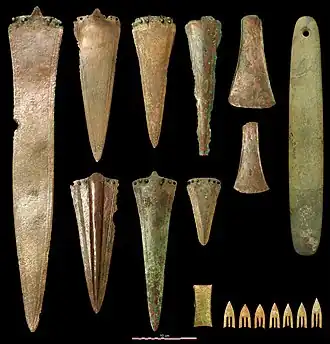 The Armorican Tumulus culture are famous for their tombs of chiefs, richly endowed with prestigious goods deposited in wooden boxes. They deliver dozens of so-called Armorican arrowheads finely cut in blond flint from the Lower Turonian deposits of the Cher valley. They are undoubtedly the work of flint craftsmen and the symbol of the power of the chiefs of the time.[8] Along with his arrows are bronze daggers and axes, the former being kept in leather scabbards and sometimes decorated with small gold studs (1 to 3 mm). One grave can accumulate up to ten daggers – beyond any measure in the rest of Western Europe in the Early Bronze Age. The daggers are of the Armorican type and generally decorated with meshes parallel to the edges and pierced with six rivet holes. More exceptionally, silver goblets, gold or silver chains, pendants and archer's armbands in amber, Whitby jet or gold and large stone sharpeners may be found in these graves.[1][9]