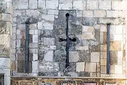 In its simplest form, an arrowslit was a narrow vertical opening; however, the different weapons used by defenders sometimes dictated the form of arrowslits. For example, openings for longbowmen were usually tall and high to allow the user to shoot standing up and make use of the 6 ft (1.8 m) bow, while those for crossbowmen were usually lower down as it was easier for the user to shoot whilst kneeling to support the weight of the weapon. It was common for arrowslits to widen to a triangle at the bottom, called a fishtail, to allow defenders a clearer view of the base of the wall.[7] Immediately behind the slit there was a recess called an embrasure; this allowed a defender to get close to the slit without being too cramped.[8] The width of the slit dictated the field of fire, but the field of vision could be enhanced by the addition of horizontal openings; they allowed defenders to view the target before it entered range.[7]