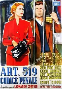 Article 519, Penal Code (Italian: Art. 519 codice penale, French: Violence charnelle) is a 1952 French-Italian crime melodrama film directed by Leonardo Cortese and starring Henri Vidal, Cosetta Greco and Paolo Stoppa.[1] The film's sets were designed by the art director Virgilio Marchi.