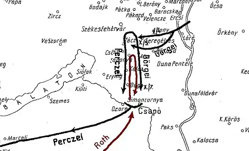 After the Battle of Pákozd of 29 September 1848—in which the Hungarian troops, led by János Móga, defeated the troops of Jelačić, saving the Hungarian capitals—Görgei's 2,500 troops, reinforced by 16,500 peasant militia from Tolna county, observed the movements of the Croatian reinforcements, led by Roth and Philipovich, blocked their retreat, and eventually forced them to surrender. Görgei's superior was General Mór Perczel, a nobleman with almost no military experience, who lacked Görgei's knowledge of the theory and practice of warfare. Seeing that some of Perczel's orders were wrong and could allow for the escape of the enemy, Görgei gave contradictory orders to his troops. Perczel became angry and wanted to put Görgei in front of a firing squad; but when the latter explained to the officers' council the reasons for his actions, Perczel accepted his plans and ostensibly pardoned, but continued to resent, him. On 7 October 1848, thanks to Görgei's plans, Roth's and Philipovich's Croatian troops were forced to surrender at Ozora, the Hungarians taking almost 9,000 prisoners, together with their weapons and ammunition, including 12 guns; this being the most successful pincer maneuver of the Hungarian freedom war.[9][10]