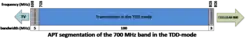 The Asia-Pacific Telecommunity (APT) band plan is a type of segmentation of the 612–806 MHz band (usually referred to as the 600 MHz & 700 MHz bands) formalized by the APT in 2022–2023 and 2008-2010 respectively[1] and specially configured for the deployment of mobile broadband technologies (e.g. most notably Long Term Evolution, LTE). This segmentation exists in two variants, FDD and TDD, that have been standardized by the 3rd Generation Partnership Project (3GPP)[2] and recommended by the International Telecommunication Union (ITU)[3] as segmentations A5 and A6,[4] respectively. The APT band plan has been designed to enable the most efficient use of available spectrum. Therefore, this plan divides the band into contiguous blocks of frequencies that are as large as possible taking account of the need to avoid interference with services in other frequency bands. As the result, the TDD option (segmentation A6) includes 100 MHz of continuous spectrum, while the FDD option (segmentation A5) comprises two large blocks, one of 45 MHz for uplink transmission (mobile to network) in the lower part of the band and the other also of 45 MHz for downlink transmission in the upper part. As defined in the standard, both FDD and TDD schemes for the 700 MHz band include guard bands of 5 MHz and 3 MHz at their lower and upper edges, respectively. The FDD version also includes a centre gap of 10 MHz. The guard bands serve the purpose of mitigating interference with adjacent bands while the FDD centre gap is required to avoid interference between uplink and downlink transmissions. The two arrangements are shown graphically in figures 1 and 2.