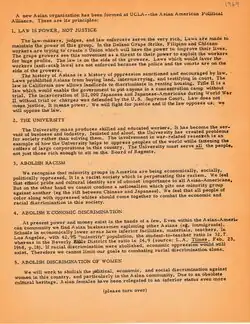"We Asian-Americans believe that American society has been, and still is, fundamentally a racist society, and that historically we have accommodated ourselves to this society in order to survive...We Asian-Americans support all non-white liberation movements and believe that all minorities in order to be truly liberated must have complete control over the political, economic, and social institutions within their respective communities. We unconditionally, support the struggles of the Afro-American people, the Chicanos, and the American Indians to attain freedom, justice, and equality… We are unconditionally against the war in Vietnam… In conclusion, I would like to add that the Asian American Political Alliance is not just another Sunday social club. We are an action-oriented group, and we will not just restrict our activities to merely ethnic issues, but to all issues that are of fundamental importance pertaining to the building of a new and a better world."[9]