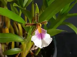 Aspasia is a genus of comparatively robust plants intermediate of Brassia and Miltonia, to which it is morphologically closer although can be distinguished because its flowers show the labellum partially fused to the column up to the middle then abruptly folded down in a square angle.[5] They are characterized for often showing am elongated rhizome, with thicker roots than Miltonia, with more elliptical or elongated and highly laterally flattened pseudobulbs, protected by some foliar sheaths shorter than the leaves, and one or two apical leaves. These are articulated, basally conduplicate, ligulate sometimes with acute apex, thin and narrow, very malleable, light green colored. The inflorescence is erect or arching, shorter than the leaves and bares one to nine flowers sometimes showy, which open in quick sequence holding at least three of four opened at the same time.[2] The inflorescence shoots among the foliar sheaths on the pseudobulbs bases.